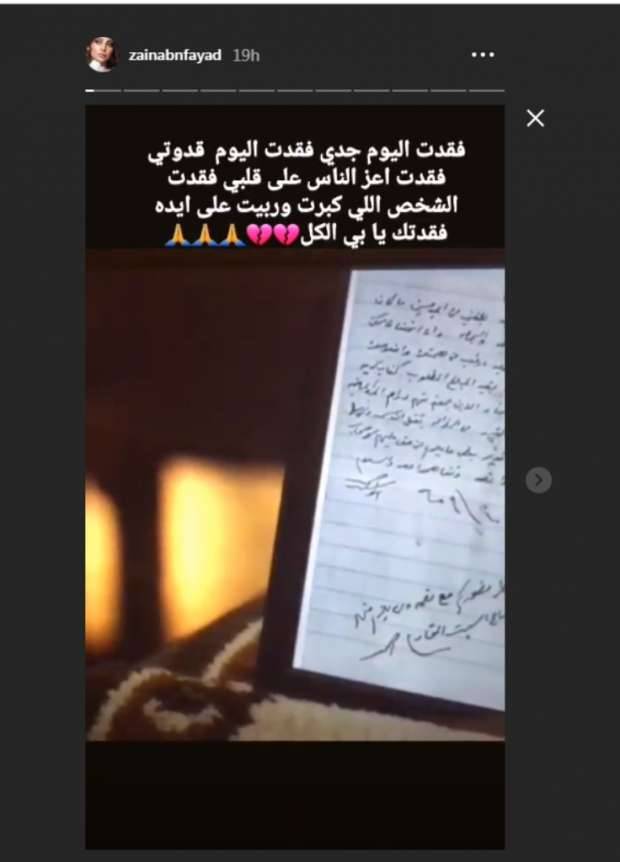 أعلنت زينب فياض، إبنة الفنانة اللبنانية هيفاء وهبي وفاة جدها لوالدها. وكشفت ذلك من خلال خاصية "ستوري" عبر حسابها على "إنستغرام" حيث كتبت: "فقدت اليوم جدي، فقدت اليوم قدوتي، فقدت أعز الناس على قلبي، فقدت الشخص اللي كبرت وربيت على أيده، فقدتك يا أبا الكل".