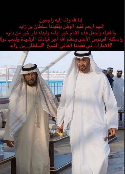 ونشرت عبر خاصية "ستوري" على حسابها على "إنستغرام" وعبر "تويتر" صورة للفقيد مع التعليق: "إنا لله وإنا إليه راجعون. اللهم ارحم فقيد الوطن وفقيدنا سلطان بن زايد واغفرله واجعل هذه الأيام خير أيامه وأبدله دار خير من داره وأسكنه الفردوس الأعلى وعظم الله اجر قيادتنا الرشيدة وشعب دولة الامارات في فقيدنا الغالي الشيخ".