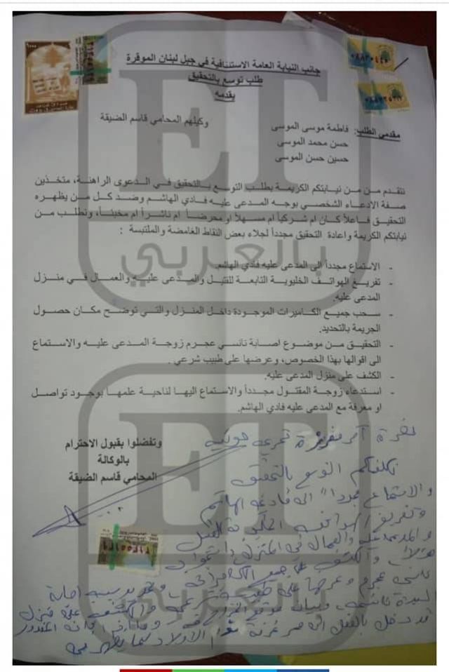 ونشر صورة لقرار التوسع في التحقيق بناء على طلب تقدم به في وقت سابق محامي أسرة القتيل قاسم الضيفة وجاء فيه: