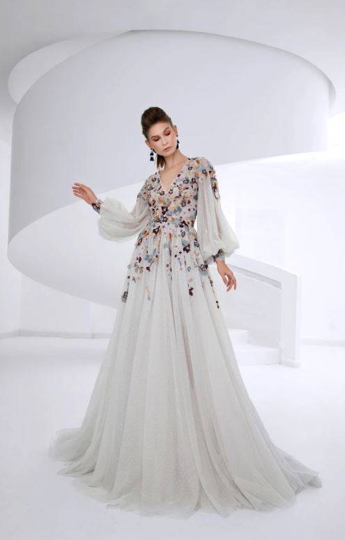 وبدت فيها وهي ترتدي فستاناً بتصميم مترف من الموسلين مع كمين طويلين واسعين وتطريزات ورود ملونة عند الصدر والخصر.