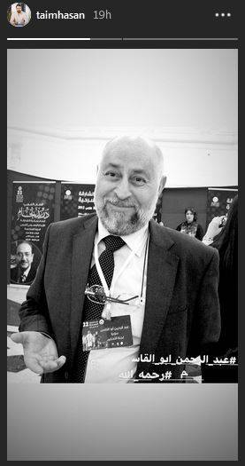 وحرص النجم باسم ياخور على نعيه بنشر صورة للرتخل عبر انستغرام وكتب عليها: "البقاء لله. الاستاذ والصديق عبد الرحمن ابو القاسم. في ذمة الله. اللهم الهم عائلته الصبر والسلوان".