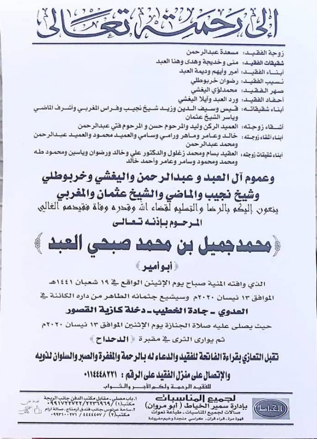 وبسبب الحجر المنزلي والإجراءات الوقائية المفروضة في سوريا في ظل إنتشار فيروس كورونا المستجد، تم تشييع الراحل في دمشق وتم التأكيد أن العزاء سيقتصر على الاتصال بأهل الفقيد.