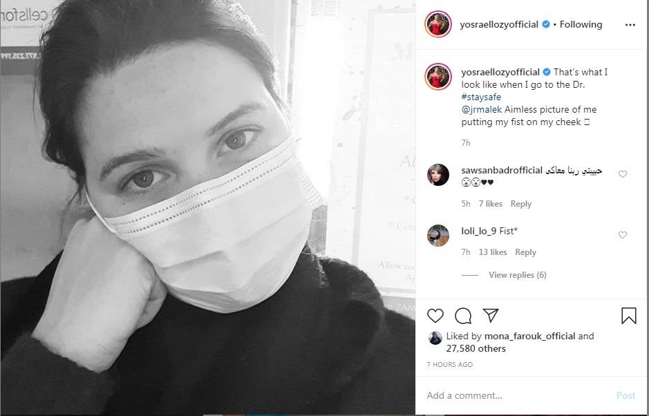 نشرت الفنانة يسرا اللوزي صورة جديدة لها على حسابها الشخصى على "إنستغرام" وهي ترتدي الكمامة، معلقة على الصورة بقولها: "هذا ما أبدو عليه عندما أذهب إلى الدكتور".