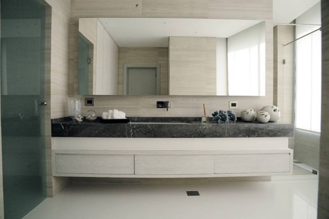 الحمّام اتّسم بكبر مساحته. باب من الزجاج يفضي إلى هذه المساحة الرحبة فيها اللون الأبيض والرخام طاغيان. وازدان حوض المغسلة والجزء العلوي بالرخام الداكن.
