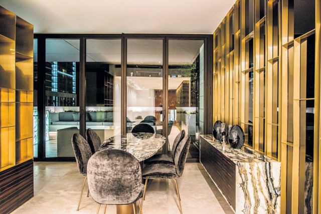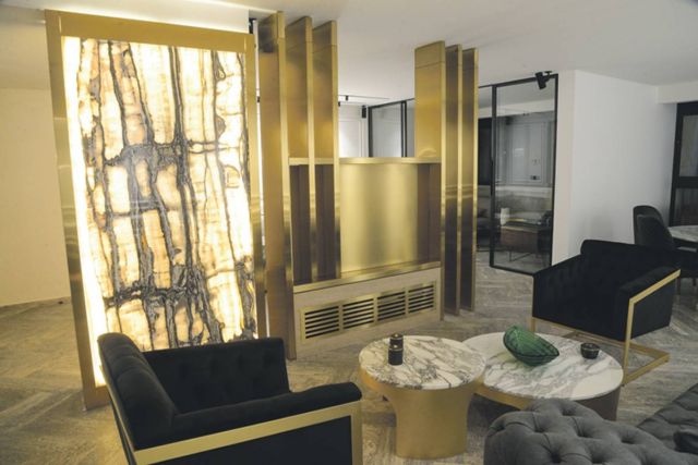 المواد الفاخرة من الرخام والأونيكس والنحاس والزجاج والخشب تداخلت بانسجام تام بخطوط هندسية فاخرة وناعمة في الوقت نفسه، فخدمت الجوّ المنشود: طراز عصري بخطوط فرنسية وأناقة مطلقة.