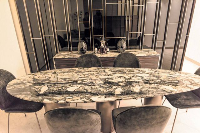 أمّا الرخام الذي كانت له الحصّة الأكبر من التصاميم الداخلية، فانتقل إلى غرفة الطعام. هنا الطاولة البيضاوية رخامية، وقد أخذت هذا الشكل تِبعاً للمساحة المستطيلة المخصّصة لها. جدارها عبارة عن أشكال مستطيلة بأحجام متفاوتة، وعُلّقت في وسطها خزانة غلّفها الرخام نفسه لوجه الطاولة. أما المقاعد حول الطاولة فهي من المخمل الرمادي، ركائزها مذهّبة. وبهذا بدا الجوّ في غاية الانسجام.