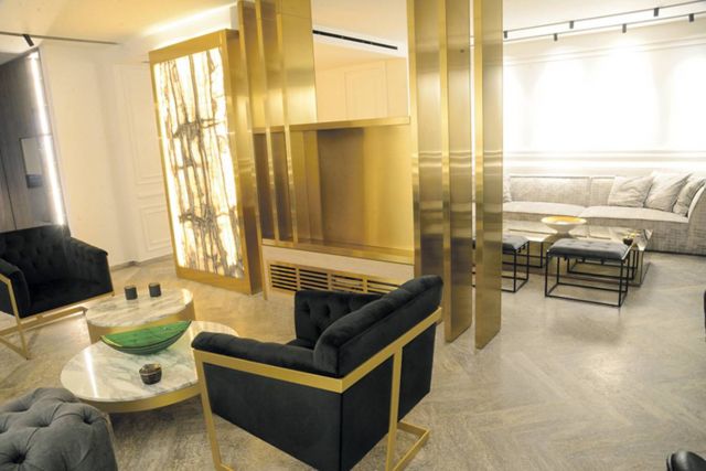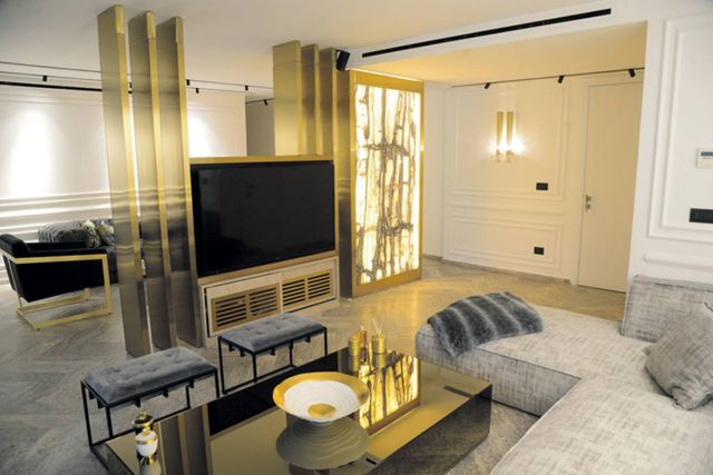 اللون الذهبي الذي شكّل الرابط بين الأجزاء كافة، ساهم في إرخاء جوّ الرفاهية الفرنسية والعصرية الأنيقة. ومن هنا نرى الجدران الجفصين التي تذكّر بعراقة القصور بلونها الأبيض الناصع، فمعظمها اكتست الجفصين وكأنه خشب محدّد بخيوط منمّقة.