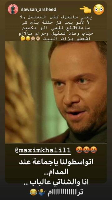 وكتبت: "بعد كل حلقة بدّي شي ساعة لأقنع نفسي إنو مكسيم حباب وهاد تمثيل وحرام ما لازم اشحطو برا البيت"، وذلك تعبيراً عن الشخصية السلبية التي يجسدها في العمل.