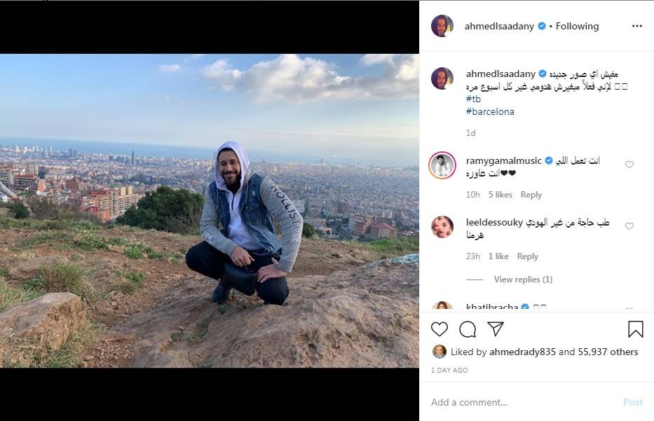 وكتب تعليقاً ساخراً على الصورة موضحاً أنه لا يوجد لديه صور جديدة لأنه لا يبدل ملابسه كثيراً، في إشارة منه إلى جلوسه في المنزل التزاماً بالإجراءات الوقائية ضد فيروس كورونا، قائلاً: "مفيش أي صور جديدة لإني فعلاً مبغيرش هدومي غير كل أسبوع مرة".