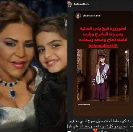 شاركت الفنانة الإماراتية أحلام الفنانة الشابة حلا الترك مناسبة احتفالها بيوم تخرجها من الثانوية. ونشرت صورة لها عبر خاصية "ستوريز" على حسابها على "إنستغرام" مع التعليق: "فخورة فيج بنتي الغالية ومبروك التخرج ويا رب أيامك نجاح وصحة وسعادة".