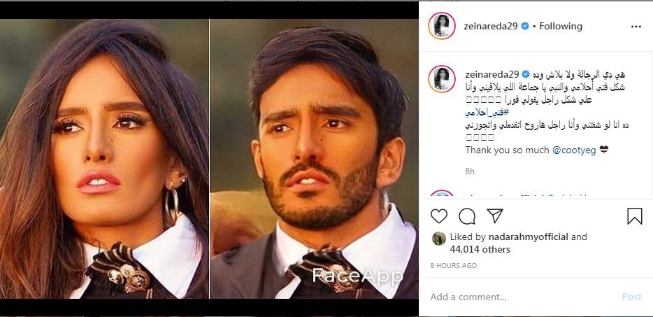 وظهرت زينة في الصورة وقد حولت وجهها من إلى ملامح رجل بشنب وذقن وذلك عن طريق برنامج "فوتوشوب" للصور، كما كتبت عليها معلقة: "هي دي الرجالة ولا بلاش وده شكل فتى أحلامى والنبي ياجماعة والنبي اللى يلاقيني وأنا شكلي راجل يقولي فورًا ده أنا لو شوفتني وأنا راجل هروح اتقدملي واتجوزني".