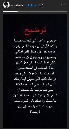 ونشر عبر خاصية القصص المصورة الملحقة على حسابه بـ"إنستغرام" رسالة طويلة كتب فيها: "من يوم ما أعلنت إني تحولت جنسياً وكما قال أبي يومها وأنا أمر بفترة صعبة جداً، لأن هناك كثير أمثالي يخاطبوني ويريدون أن أساعدهم كأني أملك القدرة على فعل شيء، وأنا لا أستطيع أن أساعد نفسي".