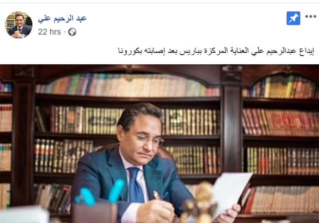 نشرت صفحة الإعلامي والبرلماني المصري عبد الرحيم علي خبراً أشار إلى إصابته بالمرض الناتج عن عدوى فيروس كورونا المستجد. وجاء في المنشور: "إيداع عبد الرحيم علي العناية المركزة بباريس بعد إصابته بكورونا".