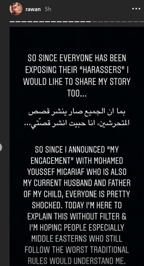 وكتبت: "بما ان الجميع صار ينشر قصص المتحرشين، أنا حبيت أنشر قصتي. منذ اعلنت ارتباطي بمحمد يوسف المقريفي الذي كان لا يزال زوجي ووالد طفلتي، أعرب الجميع عن صدمتهم. أنا هنا الآن لأشرح كل شيء من دون فيلتر وأتوجه تحديداً إلى المتابعين من الشرق الأوسط والذين ما زالوا بتبعون التقاليد الأكثر سوءًا واريد أن يفهموا ما سأقول".