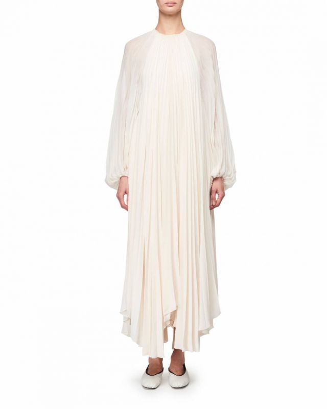 ولفتت الأنظار بارتدائها فستاناً بلون كريمي مصنوعاً من قماش ناعم متهدل وواسع. وتبين أنه من توقيع علامة The Row’s Martina. وذكر أحد المتاجر الإلكترونية ان سعره يصل إلى 7 آلاف دولار فيما أشار متجر آخر إلى أنه يبلغ 3689 دولاراً. ونسقته النجمة مع حزام عريض باللون البني أظهر نحافة خصرها ومع حذاء صيفي مسطح باللون نفسه.