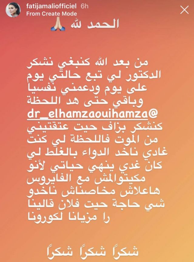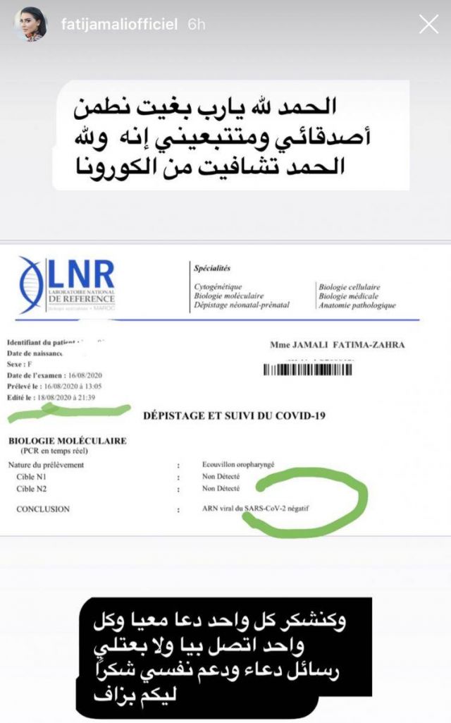 أعلنت الفنانة المغربية فاتي جمالي شفاءها من المرض الناتج من عدوى فيروس كورونا المستجد، وذلك من خلال رسالة نشرتها عبر خاصية القصص المصورة "ستوريز" على حسابها الخاص في تطبيق "إنستغرام".