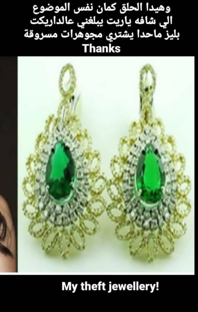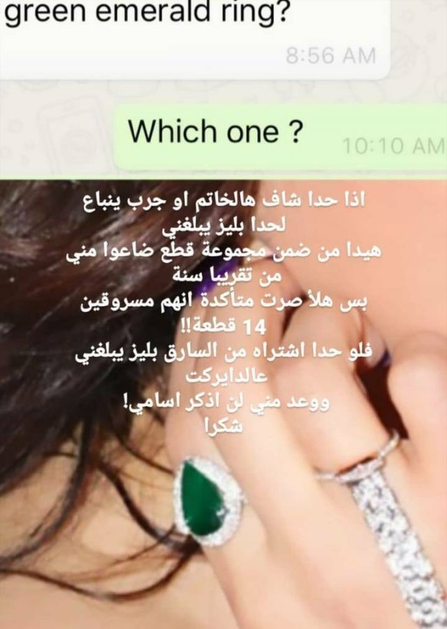 وأضافت هيفاء مناشدةً جمهورها: "فلو حدا اشتراه من السارق بليز يبلغني عالدايركت ووعد مني لن اذكر اسامي وشكرا"... ثم نشرت صورة لأقراط بتصميم مميز وبحجر أخضر أيضاً، وطلبت من متابعيها عدم شراء مجوهرات مسروقة، وفي حال حدث ذلك، التواصل معها على الخاص.