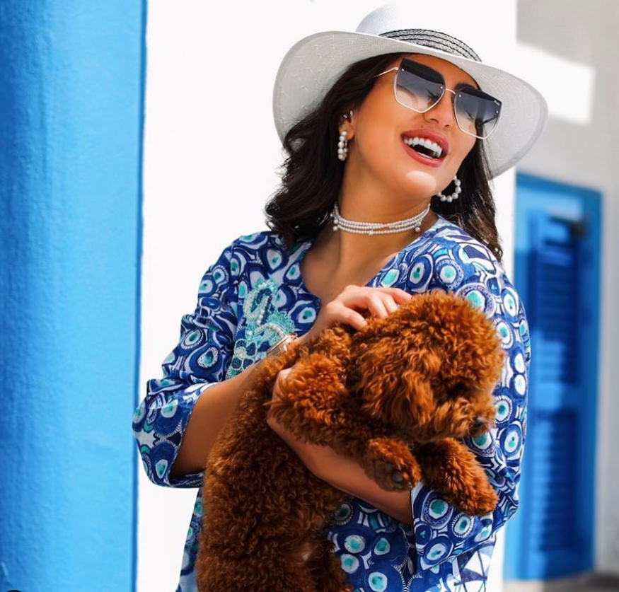 وفي أحدث الصور التي نشرتها على حسابها في تطبيق الصور والفيديوهات "إنستغرام" بدت الطويرش وهي تعتمد إطلالة صيفية. ولهذا اختارت عباءة باللون الأزرق بنقشات العين الزرقاء الدائرية تناسب الجلسات الشاطئية. وأضافت إليها قبّعة ونظّارات شمسية ومجوهرات بتصميم ناعم. أما التفصيل الذي أثار اهتمام المتابِعات من عاشقات الموضة فهو الحذاء الصيفي الموقّع من Chanel.