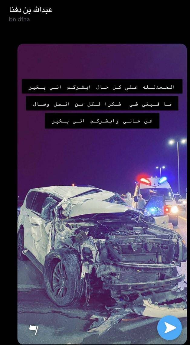 وتبين أنه تعرض لحادث سير مروع أدى إلى تحطم سيارته بالكامل. وهو ما ظهر من خلال صورة نشرها عبر حسابه الخاص على "سناب شات". وعلق: "الحمدلله على كل حال. أبشركم إني بخير ما فيني شي. شكراً لكل من اتصل وسأل عن حالي وأبشركم إني بخير".