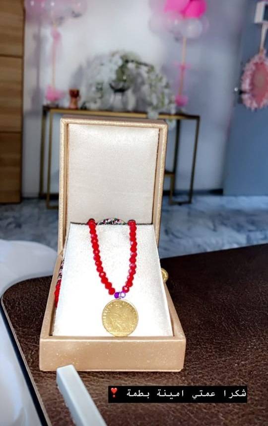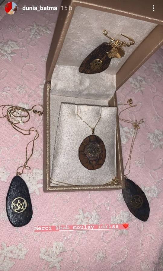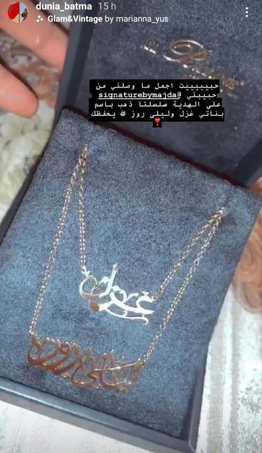 واستعرضت النجمة المغربية قلادتين تحملان اسمَي ابنتيها "غزل" و"ليلى روز"، ووصفتها بأنها "أجمل هدية". وجاء ذلك بعد نشرها مجموعة من الصور مع الطفلتين بملابس متشابهة عبارة عن قفطان مغربي بنفس اللون والتصميم ونالت إعجاب الآلاف من متابعيها.