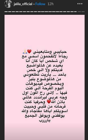 ونشرت الفنانة المثيرة للجدل منشوراً عبر خاصية الستوريز على تطبيق انستغرام كتبت فيه: "حبايبي ومتابعيني رجاءا لا تقحمون اسمي مع أي شخص أياً كان. أنا بعيدة عن هالمواضيع فديتكم ولا اللي خص بأحد".
