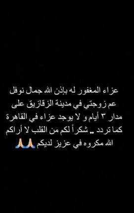 أعلن الملحن مصطفى جاد عن وفاة عم زوجته النجمة كارمن سليمان، وذلك من خلال صفحته الشخصية في "تويتر"، حيث كتب قائلاً: "البقاء والدوام لله وإنا لله وإنا إليه راجعون.. عم زوجتي الأستاذ جمال نوفل في ذمة الله.. لا أراكم الله مكروهاً في عزيز لديكم". وأضاف: "عزاء الراحل سيكون في مدينة الزقازيق لمدة 3 أيام، ولا يوجد أي عزاء في القاهرة كما تردّد"، وقدم جاد الشكر للجميع قائلاً: "شكرا لكم من القلب لا اراكم الله مكروه في عزيز لديكم".