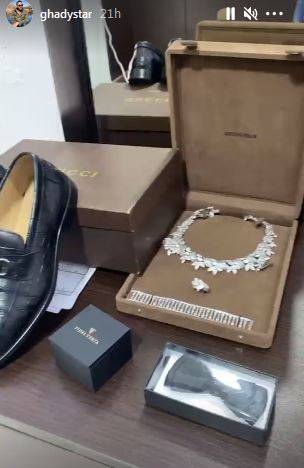 كذلك نشر العريس عبر خاصية "الستوريز" مجموعة من الصور للبدلة التي اختارها باللونين الأبيض والأسود، وزيّن الجاكيت ببروش فضي على شكل تمساح. أما العروس فتألقت بفستان أبيض "أوف شولدر" مع قفّازات طويلة من الساتان، وجاء التصميم ناعماً بقصّة ضيقة مع بعض التول من الأسفل وبتطريزات خفيفة على كامل القماش، وأضافت إليه مجموعة من المجوهرات الأنيقة.