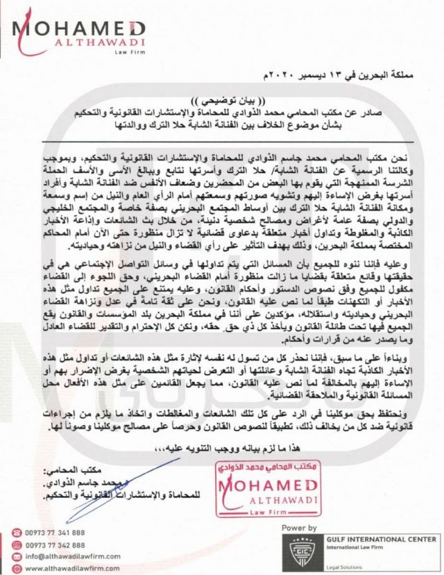 وأضاف: "نتابع ببالغ الأسى والأسف الحملة الشرسة والممنهجة التي يقوم بها البعض من المحرّضين وضعاف الأنفس ضد حلا الترك وأفراد أسرتها بغرض الإساءة إليها وتشويه صورتها وسمعتها أمام الرأي العام لأهداف ومصالح شخصية دنيئة من خلال بث الشائعات وإذاعة الأخبار الكاذبة والمغلوطة وتداول أخبار متعلقة بدعاوى قضائية لا تزال منظورة أمام المحاكم المختصة حتى الآن".