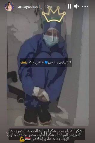 من خلال منشورات عدة على حساباتها المختلفة في مواقع التواصل الاجتماعي، دعمت الفنانة المصرية رانيا يوسف ممرضات وأطباء مصر لما يبذلونه من جهد في علاج المصابين بفيروس كورونا المستجد، مضحّين بأنفسهم في سبيل إنقاذ أرواح المرضى.