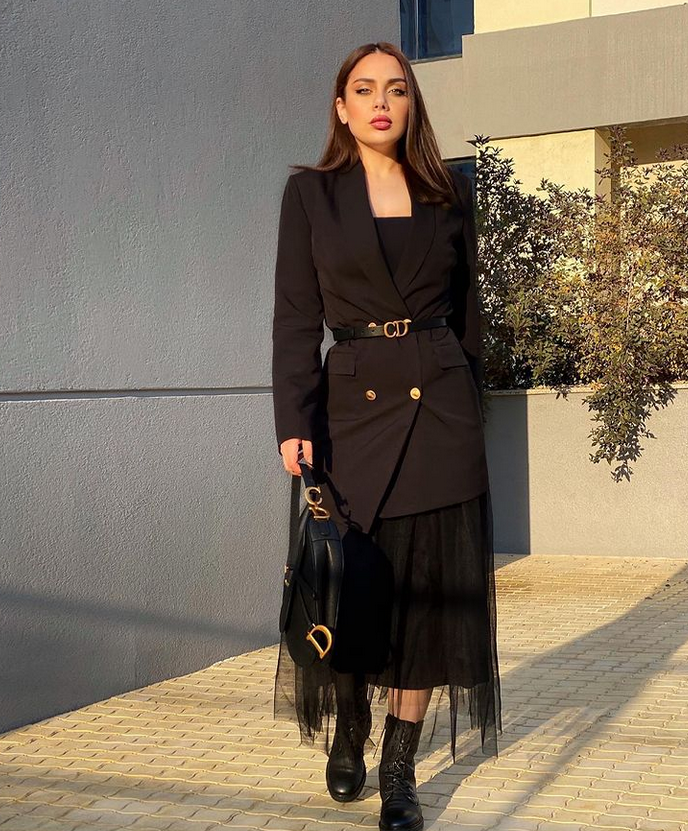 أطلّت زينب فياض، ابنة الفنانة اللبنانية هيفاء وهبي، بلوك أسود بالكامل. ولهذا نسّقت سترة كلاسيكية مع تنورة مبطّنة مصنوعة من الموسلين الشفاف، وأثارت الاهتمام بأكسسواراتها حيث أكملت الإطلالة بحذاء بساق متوسطة العلو.