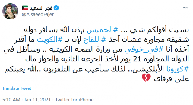 وأضافت في تغريدة أخرى: "نسيت أقولكم شي، الخميس بإذن الله بسافر دولة شقيقة مجاورة عشان آخذ اللقاح لإن بالكويت ما أقدر آخذه آنا في خوفي من وزارة الصحة الكويتية وسأظل في الدوله المجاورة 21 يوم لأخذ الجرعة الثانية والجواز مال كورونا الأبلكيشن. لذلك سأغيب عن التلفزيون الله يعينكم على فرقاي".