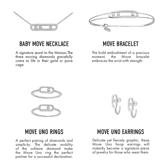 لا تنفكّ المصمّمة ڤاليري ميسيكا تطرح مجوهرات Move بحلّة جديدة كل سنة لتعبّر بصراحة عن الحبّ. تتّسم مجموعة Move بتصاميم مرحة وحديثة وثمينة ترمز إلى حُبّ الأمس، وحُبّ الحاضر، وحُبّ الغد بأحجار الألماس المتحرّكة.