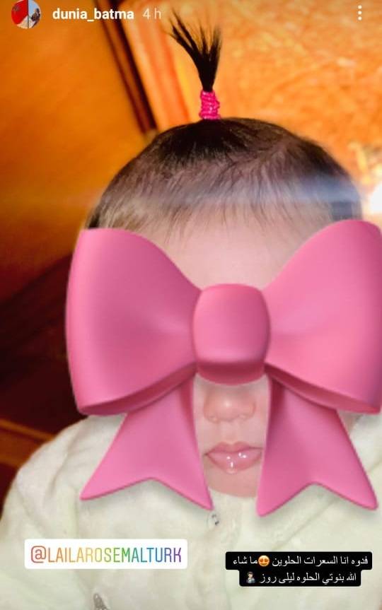 وحرصت دنيا على التقاط الصورة العفوية للطفلة بعدما قامت بربط خصلات شعرها القصيرة بطريقة طريفة وتغزلت بجمالها قائلة: "فدوة الشعرات الحلوين الله بنوتي الحلوة ليلى روز".