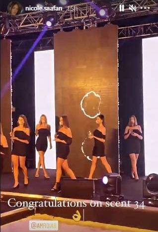 أعلنت عارضة الأزياء السورية نيكول سعفان حضورها حفل إطلاق عطر النجم المصري عمرو دياب في دبي من خلال صور نشرتها عبر خاصية "الستوريز" الملحقة بحسابها على تطبيق "إنستغرام".