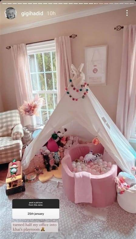 ردّت عارضة الأزياء العالمية جيجي حديد على طلب أحد متابعيها بنشر صورة التقطتها في 25 كانون الثاني عبر خاصية الستوريز هلى تطبيق انستغرام، كشفت من خلالها على ديكور جزء من غرفة ابنتها خاي من زوجها زين مالك.