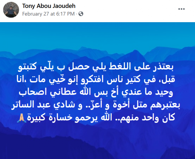 وبعدها خرج أبو جودة عن صمته وأوضح من خلال الحساب نفسه أن الراحل ليس شقيقه فعلاً، بل هو مقرّب منه إلى حد كبير وبمثابة شقيقه. وكتب: "بعتذر على اللغط يلي حصل بيلّي كتبتو قبل. في كتير ناس افتكروا إنو خّيي مات". وأضاف: "أنا وحيد ما عندي أخ بس الله عطاني أصحاب بعتبرهم متل أخوة و أعزّ. وشادي عبد الساتر كان واحد منهم. الله يرحمو خسارة كبيرة".