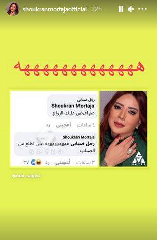 تلقّت الفنانة السورية شكران مرتجى عرضاً للزواج من شاب يتابعها على مواقع التواصل الاجتماعي، وحرصت على الردّ عليه بطريقتها الخاصة... وشاركت متابعيها على خاصية "الستوريز" الملحقة بحسابها على تطبيق "إنستغرام" بمنشور للحوار الذي دار بينها وبين الشاب الذي يلقّب نفسه بـ"رجل ضبابي"، إذ كتب لها: "عم أعرض عليكِ الزواج"، لتردّ عليه بطرافة قائلةً: "بس تطلع من الضباب".
