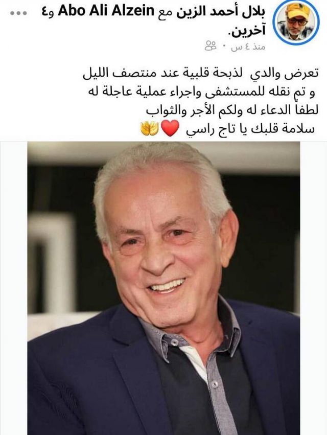 وأشار بلال أحمد الزين من خلال حسابه الخاص على "فيسبوك" إلى أن والده تعرض لذبحة قلبية وكتب: "تعرض والدي لذبحة قلبية عند منتصف الليل وتم نقله إلى المستشفى وإجراء عملية عاجلة له. لطفاً الدعاء له ولكم الأجر والثواب. سلامة قلبك يا تاج راسي".