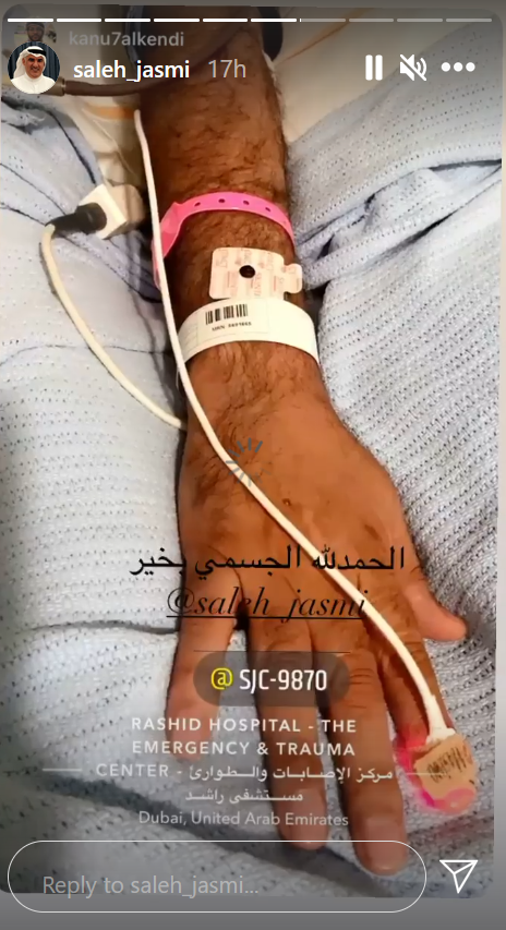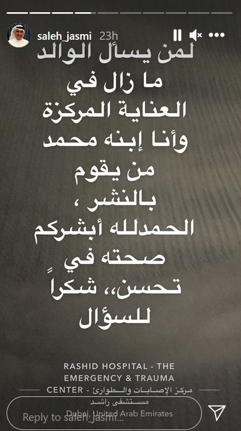كذلك نشر ابن الجسمي في وقت لاحق صورة لوالده بدا فيها وهو ممدّد على سرير في المستشفى من دون إظهار وجهه، وأرفقها بالتعليق: "اللهم اشف أبي وأبعد عنه كل ما يتعبه، اللهم ارزقه الصحة والعافية يا رب واجعله سالماً وعافى لا ضرر فيه. رب اشفه شفاءً لا يغادر سقماً".