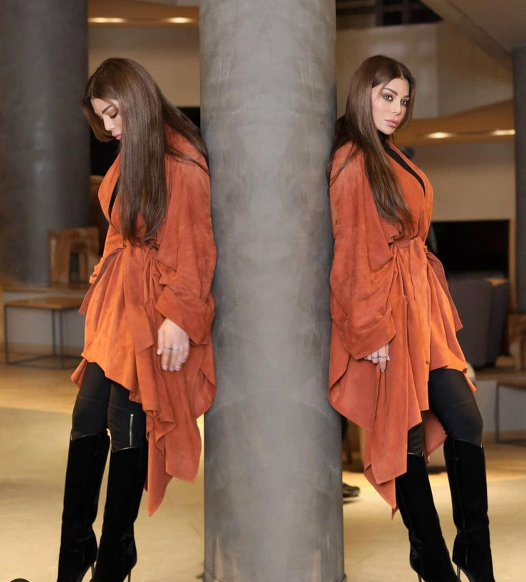 نسّقت هيفاء سترة من Balmain باللون البرتقالي مع سروال لاغينغ أسود جامعةً بذلك البساطة واللمسات الفريدة. وأكملت الإطلالة بحذاء عالي الساق والكعب من Tom Ford ويصل سعره على أحد المتاجر الإلكترونية إلى 409 دولارات أميركية.