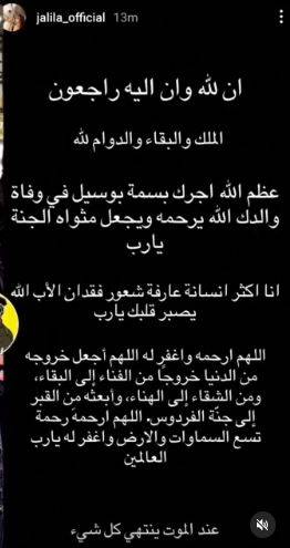 ونشرت جليلة عبر خاصية الستوريز على تطبيق إنستغرام منشورا جاء فيه: "إنا لله وإنا إليه راجعون. . الملك والبقاء والدوام لله. . عظم الله أجرك بسمة بوسيل بوفاة والدك الله يرحمه ويجعل مثواه الجنة يا رب. . أنا أكثر إنسانة عارفة شعور فقدان الأب الله يصبر قلبك يارب".