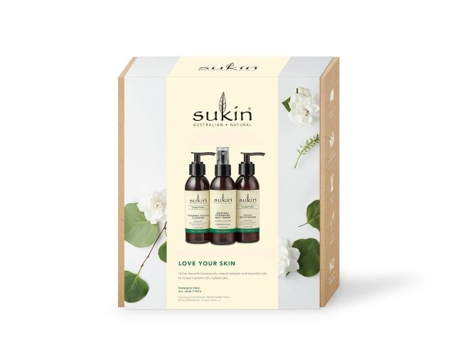 مجموعة Love Your Skin من Sukinهي مزيج غني من مستخلصات النباتات، والزيوت الأساسية، والمكونات الطبيعية من أجل برنامج يومي للعناية بالبشرة يشمل تنظيف البشرة ومعادلة لونها وترطيبها. تحتوي المجموعة على ثلاثة منتجات فعّالة تتضمن رغوة تنظيف الوجه ، وتونر بخاخ للترطيب، ومرطّب الوجه.