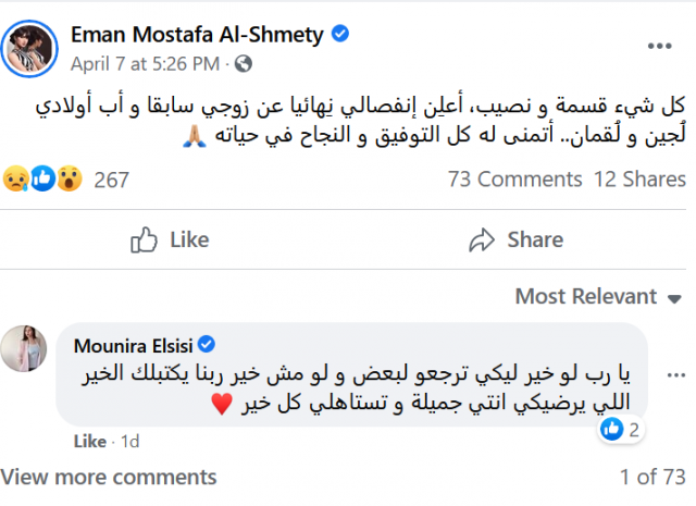 وورد على حساب يحمل اسمها على "فيسبوك" هذا التعليق: "كل شيء قسمة ونصيب. أعلن انفصالي نهائياً عن زوجي سابقاً وأب أولادي لجين ولقمان. أتمنى له كل التوفيق والنجاح في حياته"... وفاجأ هذا المتابعين الذين تساءلوا عن سبب الانفصال.