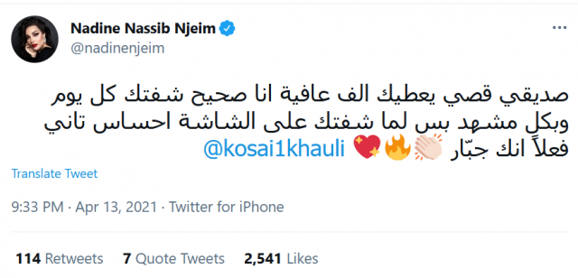 وجهت الفنانة اللبنانية نادين نسيب نجيم، من خلال حسابها الخاص في "تويتر"، رسالة إلى زميلها في مسلسل "عشرين عشرين" الممثل السوري قصي خولي عبرت فيها عن إعجابها بأدائه.