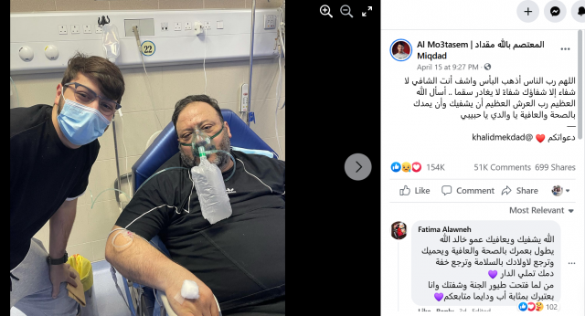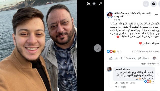 نشر نجم قناة "طيور الجنّة" المعتصم بالله المقداد، على حسابه الخاص في "فيسبوك" صورة جمعته ووالده مؤسّس القناة خالد المقداد وأرفقها بتعليق أشار فيه إلى مرض الأخير وكتب: "اللَّهُمَّ إِنِّي أَسْأَلُكَ بِاسْمِكَ الأَعْظَمِ ، الَّذِي إِذَا دُعِيتَ بِهِ أَجَبْتَ ، وَإِذَا سُئِلْتَ بِهِ أَعْطَـيْتَ أن تشفي أبي وحبيبي ورفيقي خالد مقداد وأن تلبسه ثوب الصحة والعافية وأن ترده إلينا سالماً معافى يا رب العالمين ويا من لا يُعجزك شيء في الأرض ولا في السماوات ادعوا له يا حبايبي".