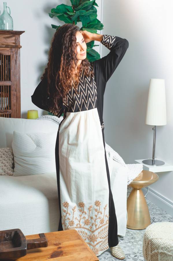 هذا الدمج بين التراث والحضارة التي تحرص المصممة للحفاظ عليه في كل مجموعة، يأخذ طابعاً عصرياً يكسر الصورة النمطية للثوب. كما يمكن تنسيق القطعة لإرتدائها بشكل مختلف في الزيارات الرسمية كما المناسبات اليومية.