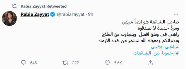 ويبدو أن هذا أغضب زوجته الإعلامية رابعة الزيات التي سارعت إلى الرد بقسوة من خلال حسابها الخاص في "تويتر" وغرّدت: "صاحب الشائعة هو ايضاً مريض ومرةً جديدة لا تصدقوه زاهي في وضع أفضل ويتجاوب مع العلاج وبدعائكم ومعونة الله سنمر من هذه الأزمة".
