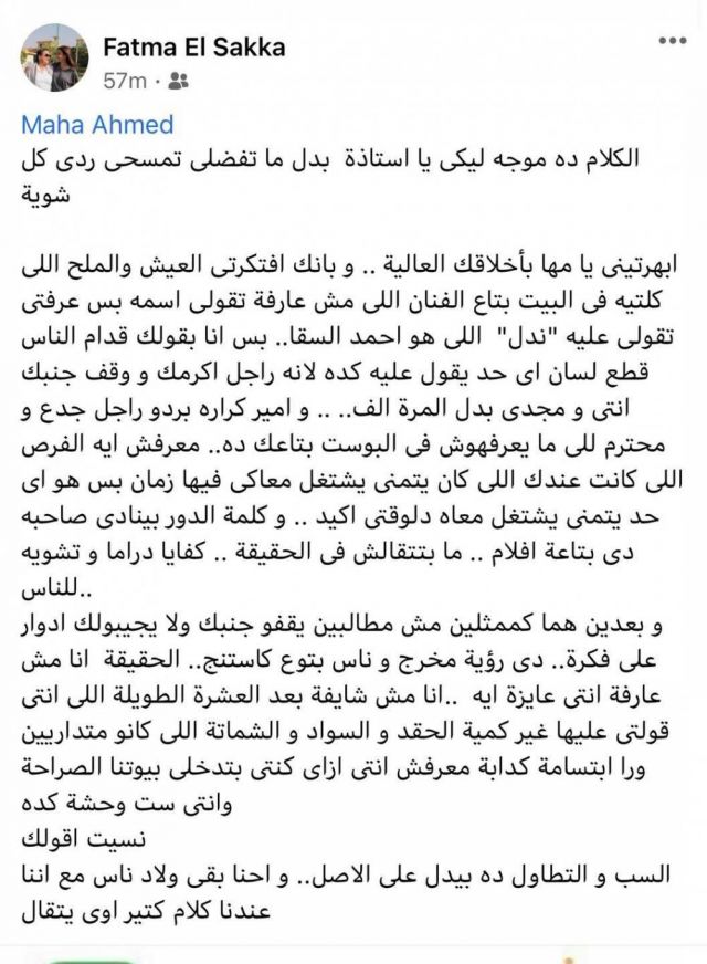وقالت فاطمة السقا من خلال صفحتها على "فيسبوك": "الكلام ده موجه ليكي يا أستاذة، بدل ما تفضلي تمسحي ردي كل شوية.. أبهرتيني يا مها بأخلاقك العالية، وبأنك افتكرتي العيش والملح اللي كلتيه في البيت بتاع الفنان اللي مش عارفة تقولي اسمه بس عرفتي تقولي عليه (ندل) اللي هو أحمد السقا.. بس أنا باقولك قدام الناس، قطع لسان أي حد يقول عليه كده لأنه راجل أكرمك ووقف جنبك أنت ومجدي بدل المرة ألف".