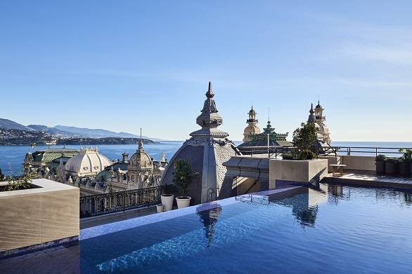 ويتألق الجناح بشرفة فارهة مؤلفة من طابقين تبلغ مساحتها 135 متر مربع وتوفر إطلالة تخطف الأنفاس على ساحة ’بلاس دو كازينو‘، فيما يضم الطابق العلوي من الشرفة مسبحاً حاراً متماهياً مع الأفق بمساحة تبلغ 37 متر مربع (بطول 10 متر وعرض 3.70 متر). ويتصل المسبح من الجهتين بدرجٍ يصل إلى الطابق السفلي من التراسحيث يمكن للضيوف الجلوس والاستمتاع بالإطلالة الساحرة على ساحة ’بلاس دو كازينو‘ التي تعتبر قلب موناكو النابض بالبهجة والحيوية والتي تستضيف سباق جائزة موناكو الكبرى، أحد أهم سباقات الفورمولا 1 في العالم والذي يقام في شهر أيار من كل عام.