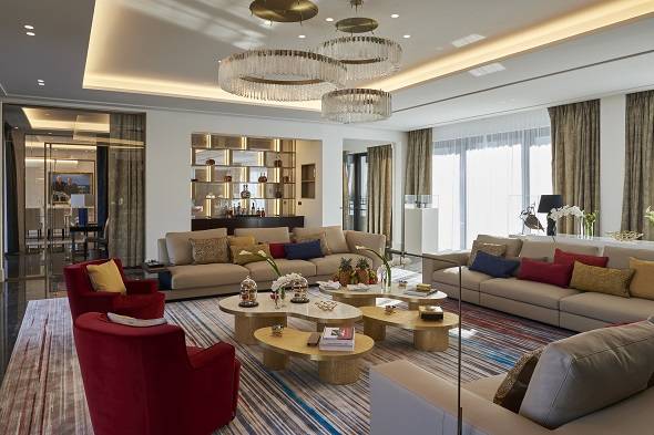 يتضمن الجناح بمساحته الداخلية التي تبلغ 525 متر مربع غرفتي نوم وردهة واسعة مع ركن مشروبات أنيق، فضلاً عن ردهة أصغر حجماً تضم مكتبة وغرفة مخصصة لتناول الطعام ومكتب. كما يمكن زيادة مساحة الجناح لتصل إلى 600 متر مربع بفضل وجود غرفة إضافية. وتتميز كل غرفة نوم بحمام خاص مجهز بغرفة بخار وبتصاميم عصرية تمزج بين الألوان المشرقة والرخام والزجاج الفاخر، إلى جانب غرفة ساونا زجاجية تتمتع بإطلالة ساحرة على سماء البحر المتوسط.